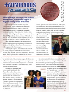 2025 Patrocínio Apoio Apoio de divulgação Realização 50; e Aline Aguiar (TV Globo), que na última edição ficou na décima colocação entre os +Admirados do País. Na categoria Áudio/Texto, a palavra Renovação ganha destaque. Os TOP 5 foram formados por jornalistas que pela primeira vez aparecem na relação de vencedores dos +Admirados Jornalistas Negros da Imprensa. A primeira colocada foi Edilene Lopes, da Rádio Itatiaia e CNN Brasil. Nos demais TOP 5 ficaram, pela ordem, Ed Wanderley (Agência Pública), Cecilia Oliveira (The Intercept Brasil), Cíntia Gomes (Agência Mural) e Juliana Cézar Nunes (EBC). A premiação também elegeu os profissionais e veículos vencedores nas categorias temáticas. Em Imagem/Vídeo, o primeiro lugar ficou com Marcela Bonfim (Amazônia Negra), que venceu pelo segundo ano consecutivo a categoria. A vencedora de Veículo Geral foi a Agência Pública e o primeiro lugar de Veículo Liderado por Jornalistas Negros foi para Alma Preta, agora bicampeã da categoria. Nas categorias regionais, os vencedores foram: Fabiana Moraes, na região Nordeste, que se tornou bicampeã da categoria; Dulcinéia Novaes, no Sul, que no ano passado esteve entre os TOP 50 +Admirados do País; Afonso Ferreira, na região Centro-Oeste, um dos nomes que pela primeira vez aparece na lista de vencedores do prêmio; e Tayana Narcisa, no Norte, também estreante na premiação. Além dos reconhecimentos para os profissionais e veículos, na cerimônia foram entregues os prêmios especiais Troféu Luiz Gama, concedido a um decano e uma decana negros que sejam referência para o jornalismo brasileiro; e o Troféu Glória Maria para a Personalidade do Ano. O Troféu Luiz Gama foi entregue para os jornalistas Antonio Carlos Fon, ex-presidente do Sindicato dos Jornalistas de SP, que teve passagens por JT, Veja, IstoÉ e Quatro Rodas; e Céres Marisa Silva dos Santos, ativista do movimento negro, coordenadora do Conselho de Promoção da Igualdade Racial, em Juazeiro, na Bahia, e professora da UNEB. E o Troféu Glória Maria foi para as mãos de Flávia Martins, fundadora da Consultoria Diversidade Sustentável, ex-diretora do Museu Afro Brasil e ex-presidente de DEI da TransUnion para o Brasil, eleita a Personalidade do Ano. O Prêmio +Admirados Jornalistas Negros e Negras da Imprensa Brasileira 2025 contou com patrocínios de Unilever e Uber, e apoio da GSS Carbono e Bioinovação. Veja a seguir como foi a cerimônia de premiação. Ela também pode ser conferida no YouTube Oscar Luis (Neo Mondo), Rosenildo Ferreira (1 Papo Reto), Antônio Carlos Fon e Eduardo Ribeiro (Jornalistas&Cia)